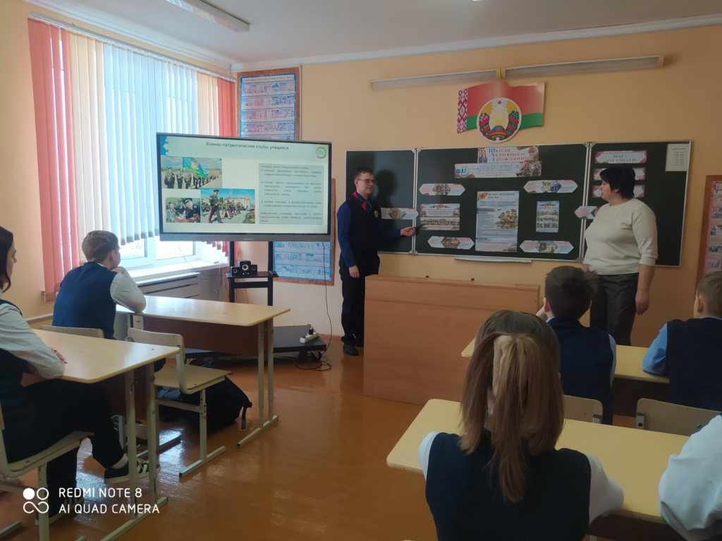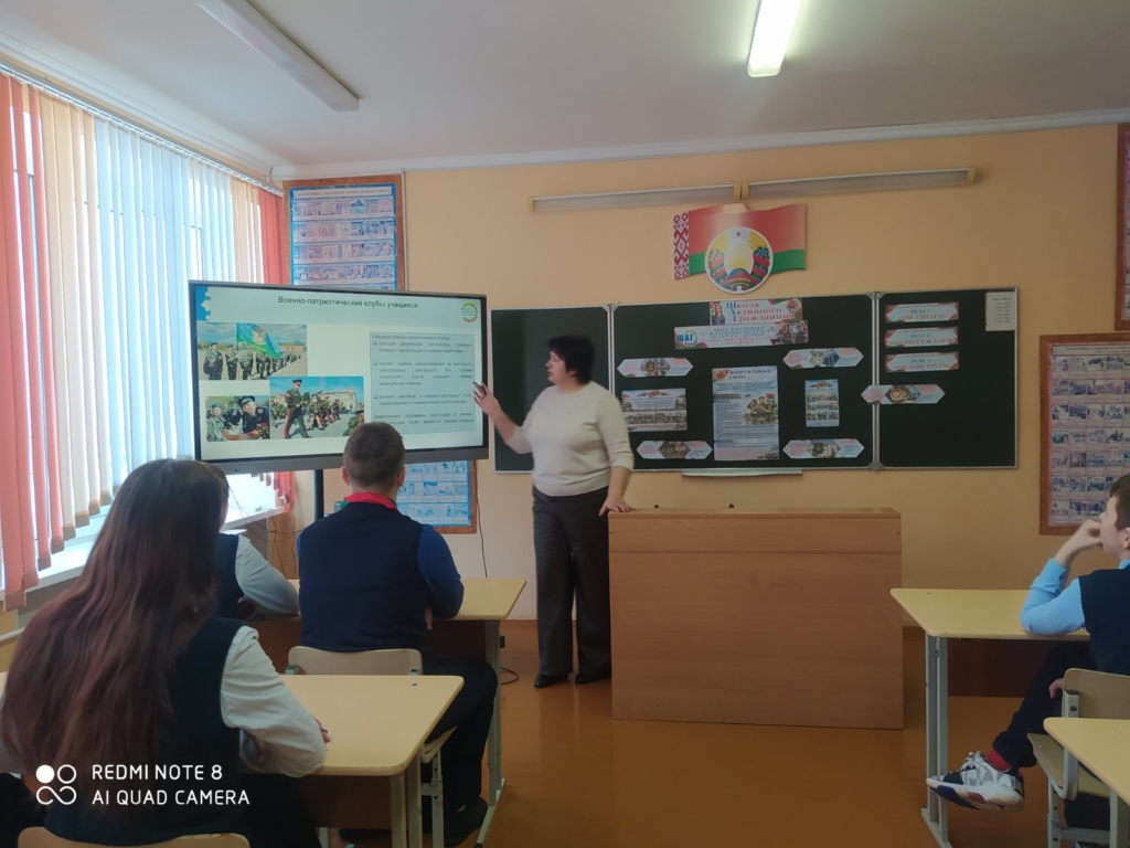 29 января для учащихся 8-11 классов в рамках информационно-образовательного проекта «ШАГ», прошло занятие «Быть достойным гражданином Республики Беларусь — значит быть готовым в любую минуту встать на защиту Родины». Ребята узнали об учебных заведениях, где можно получить военные специальности, об особенностях военной службы. На мероприятии присутствовал Маковецкий Николай Леонидович, руководитель по военно-патриотическому воспитанию.