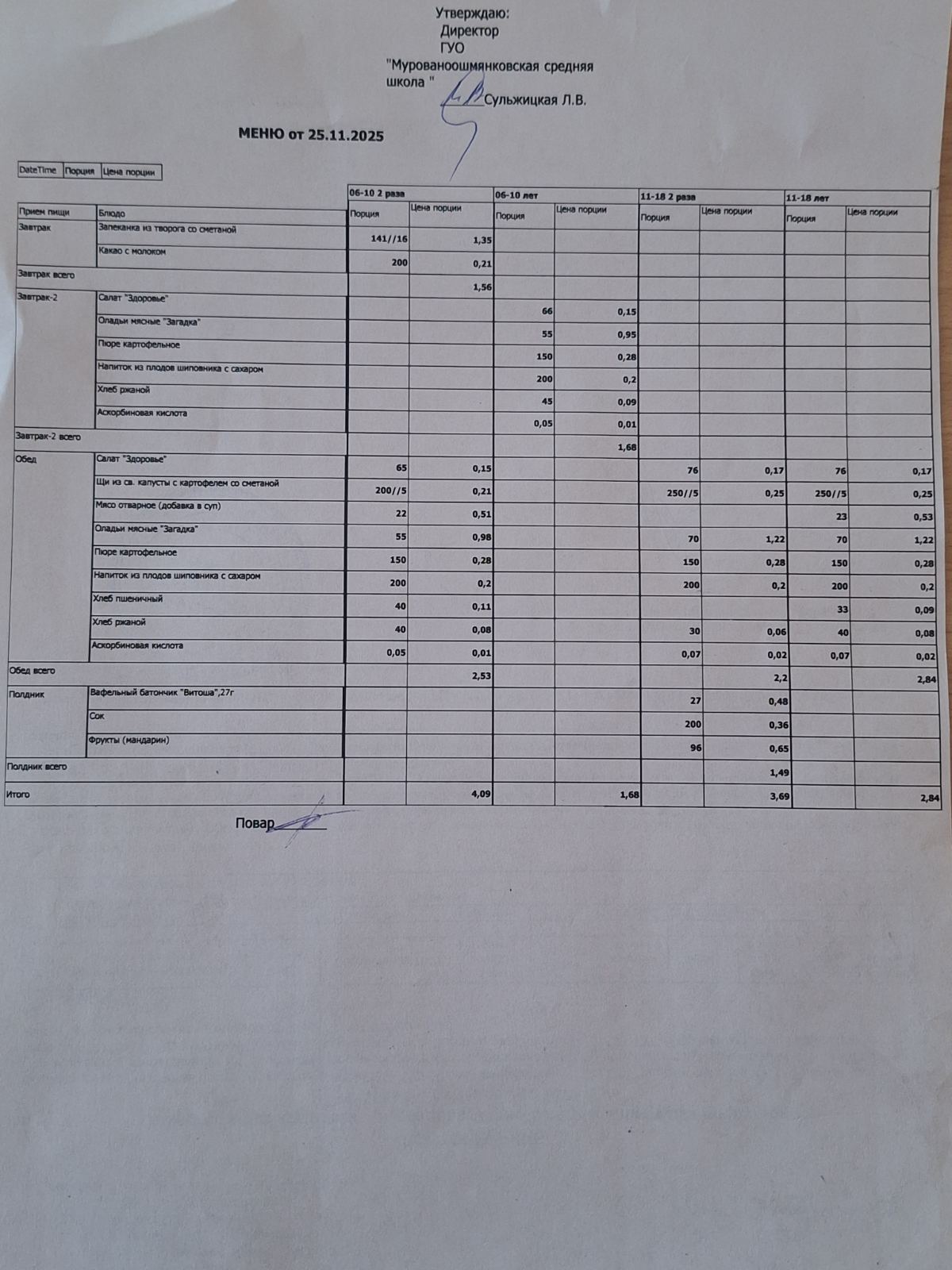 На основании сформированных примерных двухнедельных рационов питания с учетом товарного обеспечения, местных и иных особенностей составляются дневные рационы питания (меню), единые для обучающихся, которым предусмотрено питание за счет бюджетных средств, а также за счет средств родителей (законных представителей).